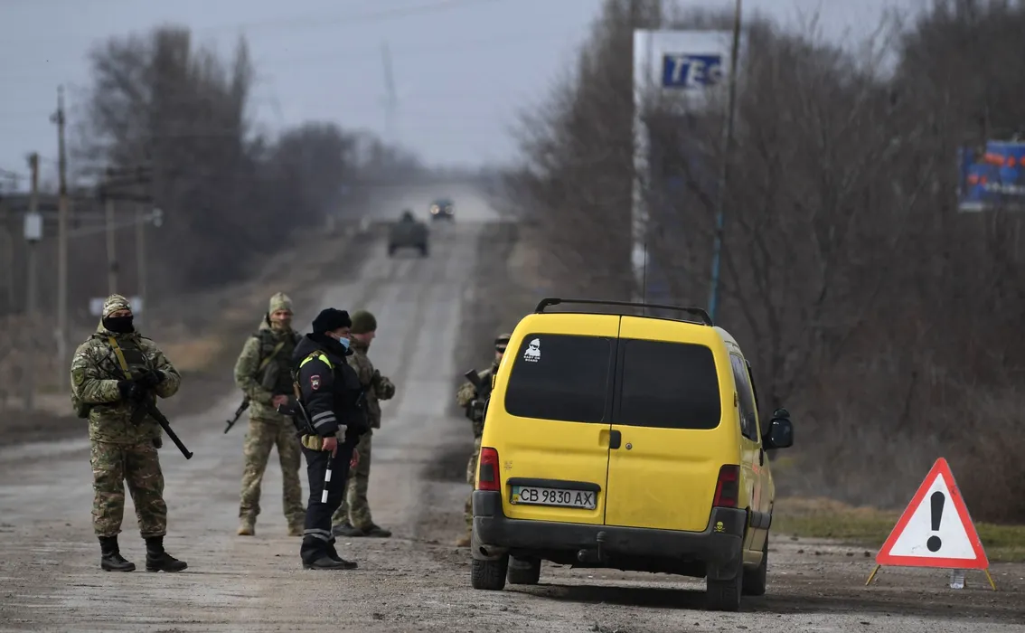 8125733 24.02.2022 Russian law enforcement officers stand guard at the Armyansk checkpoint in the northern part of Crimea, Russia. On February 24 Russian President Vladimir Putin announced a military operation in Ukraine following recognition of independence of breakaway Donbas republics. Konstantin Mihalchevskiy / Sputnik