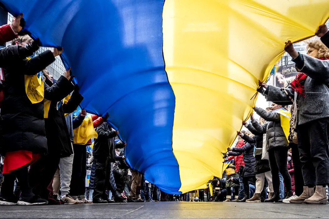 24 February 2022, US, New York: Demonstrators hold a large Ukrainian flag during the "Stop Putin" rally against the Russian invasion of Ukraine. Photo: Michael Brochstein/ZUMA Press Wire/dpa
