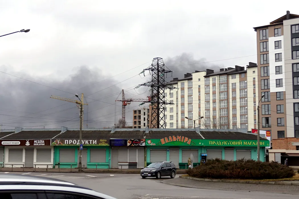 24 February 2022, Ukraine, Ivano-Frankivsk: Smoke rises from behind residential buidlings in Ivano-Frankivsk, western Ukraine. Photo: -/Ukrinform/dpa