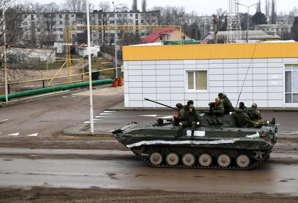 8125963 25.02.2022 Russian servicemen ride an armored vehicle in Armyansk in the northern part of Crimea, Russia. On February 24 Russian President Vladimir Putin announced a military operation in Ukraine following recognition of independence of breakaway Donbas republics. Konstantin Mihalchevskiy / Sputnik