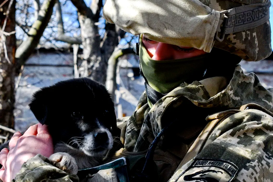 February 20, 2022, Verkhnotoretske, Donetsk, Ukraine: A Ukrainian serviceman is seen holding a puppy on the frontline in the Verkhnotoretske village that is situated on the very frontline in eastern Ukraine..In the ongoing Russia Ukraine crisis, the United States still stands at saying that Moscow could attack Kyiv at any instance. Meanwhile, Ukraine has said that it has recorded over 100 ceasefire violations just a day after heavy weapons fire and President Volodymyr Zelensky reaffirmed his trust on country's intelligence. (Credit Image: © Andriy Andriyenko/SOPA Images via ZUMA Press Wire)