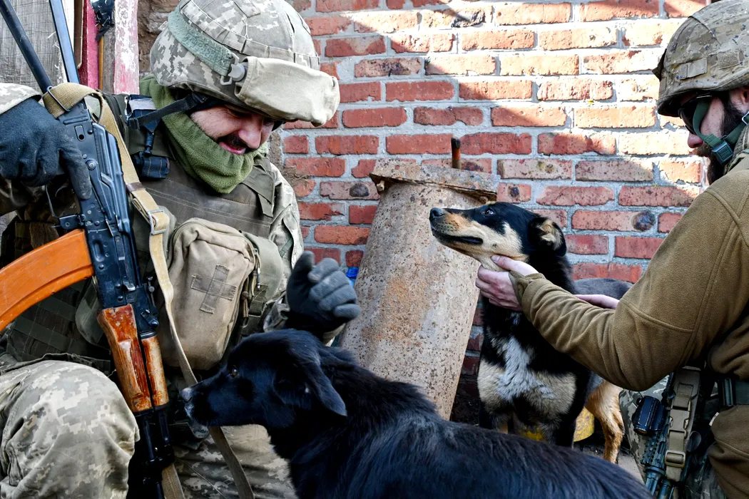 February 20, 2022, Verkhnotoretske, Donetsk, Ukraine: Ukrainian servicemen are seen playing with dogs on the frontline in the Verkhnotoretske village that is situated on the very frontline in eastern Ukraine. .In the ongoing Russia Ukraine crisis, the United States still stands at saying that Moscow could attack Kyiv at any instance. Meanwhile, Ukraine has said that it has recorded over 100 ceasefire violations just a day after heavy weapons fire and President Volodymyr Zelensky reaffirmed his trust on country's intelligence. (Credit Image: © Andriy Andriyenko/SOPA Images via ZUMA Press Wire)