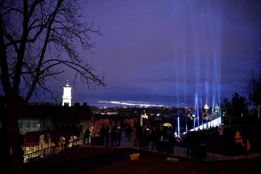 February 20, 2022, Kyiv, Ukraine: LVIV, UKRAINE - FEBRUARY 20, 2022 - The pillars of light are directed into the evening sky during the Rays of Maidan event at the Heavenly Hundred Heroes Memorial as Ukraine remembers those who died during the 2014 Revolution of Dignity, Lviv, western Ukraine. (Credit Image: © Markiian Lyseiko/Ukrinform via ZUMA Press Wire)