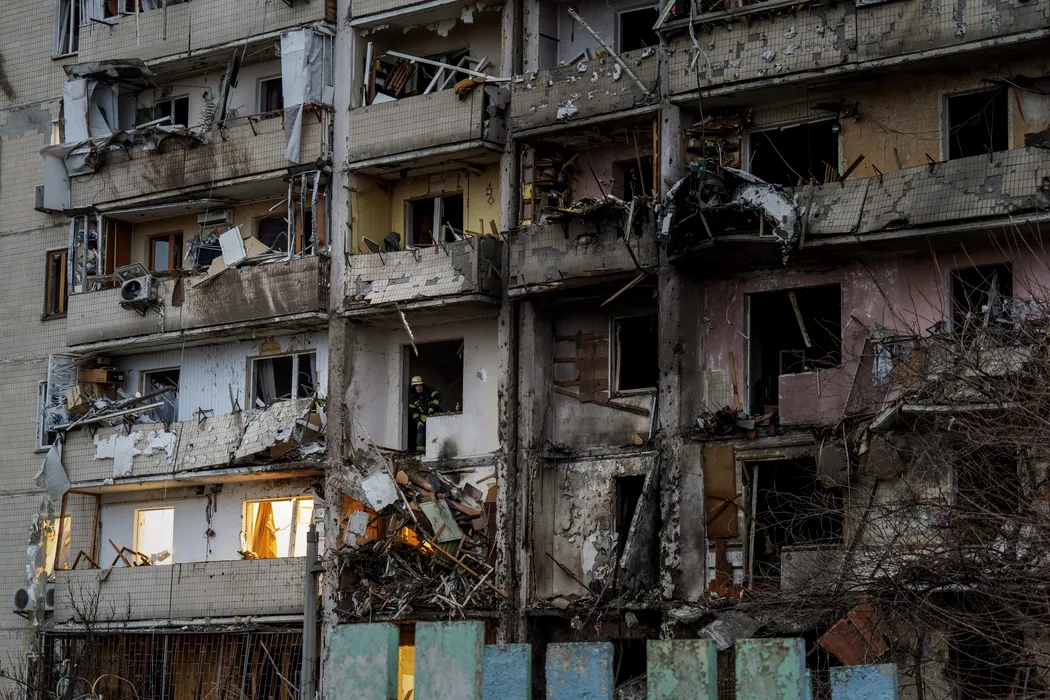 A fire-fighter inspects the damage at a building following a rocket attack on the city of Kyiv, Ukraine, Friday, Feb. 25, 2022. (AP Photo/Emilio Morenatti)