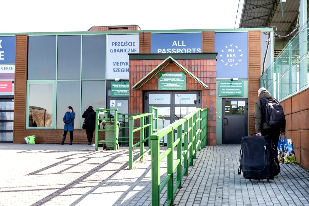 People approach at a passport check point to enter Ukraine after Russia bombarded Ukrainian territory - Polish-Ukrainian border crossing in Medyka, Poland on February 24, 2022. As the Russian Federation army crossed Ukrainian borders the conflict between Ukraine and Russian is expected to create a wave of Ukrainian refugees of which most will seek asylum in Poland.