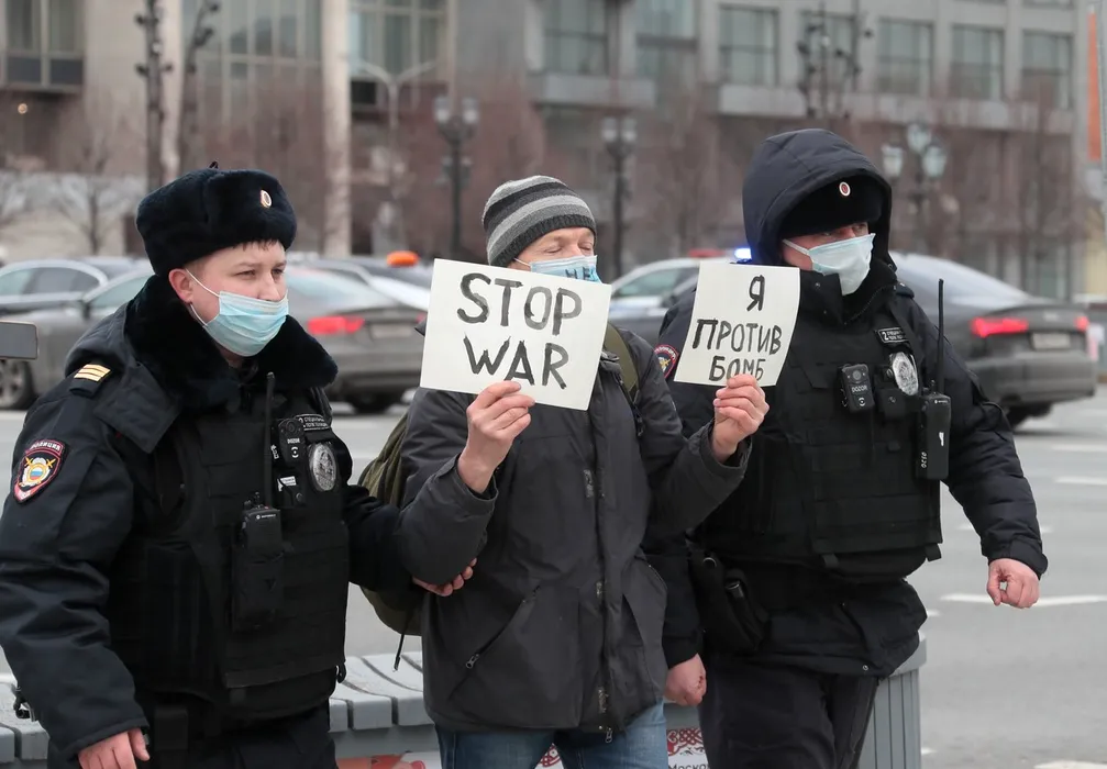 8125299 24.02.2022 Police officers detain a participant of a single picket of an anti-war protest against Russia's military operation in Ukraine, on Pushkin Square in Moscow, Russia.,Image: 664669441, License: Rights-managed, Restrictions: , Model Release: no, Credit line: Profimedia