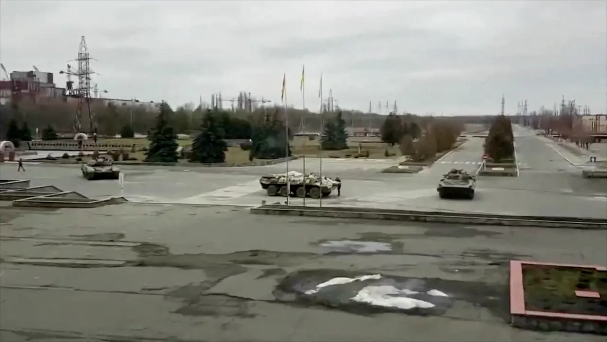 Image grab from video shows with Russian armoured vehicles on the territory of the captured Chernobyl nuclear power plant in Pripyat, Ukraine, on Thursday Feb 24, 2022. Ukrainian Prime Minister Denys Shmyhal said that Russia's forces have seized control of the former Chernobyl nuclear power plant near Pripyat, around 60 miles from the capital Kyiv, following fierce clashes with government forces.,Image: 664753328, License: Rights-managed, Restrictions: , Model Release: no, Credit line: Profimedia
