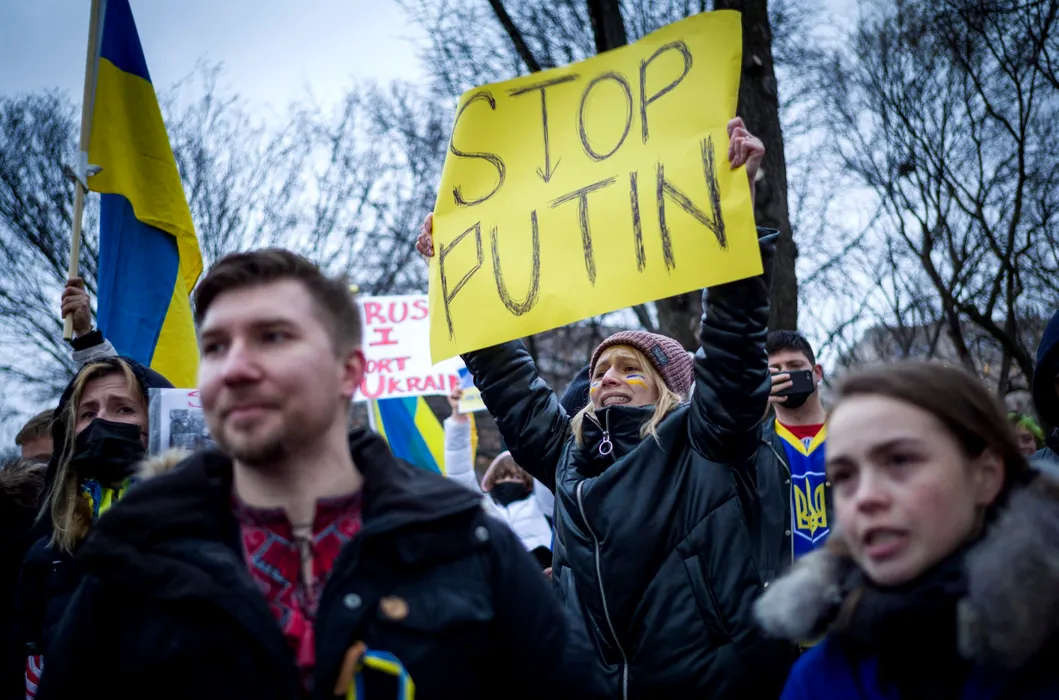 Activists hold placards and flags as they gather in Lafayette Square to protest Russia's invasion of Ukraine in Washington, DC, on February 24, 2022. Russian President Vladimir Putin launched a full-scale invasion of Ukraine on February 24, unleashing air strikes and ordering ground troops across the border in fighting that Ukrainian authorities said left dozens of people dead.,Image: 664770726, License: Rights-managed, Restrictions: , Model Release: no, Credit line: Profimedia