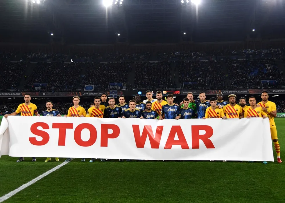 February 24, 2022, Naples: SSC Napoli's and FC Barcelona's players hold a banner reading ''Stop war'' before the UEFA Europa League play-off second leg soccer match between SSC Napoli and FC Barcelona at the Diego Armando Maradona stadium in Naples, Italy, 24 February 2022..ANSA/ SSC NAPOLI PRESS OFFICE .+++ ANSA PROVIDES ACCESS TO THIS HANDOUT PHOTO TO BE USED SOLELY TO ILLUSTRATE NEWS REPORTING OR COMMENTARY ON THE FACTS OR EVENTS DEPICTED IN THIS IMAGE; NO ARCHIVING; NO LICENSING,Image: 664799185, License: Rights-managed, Restrictions: * Italy Rights Out *, ***