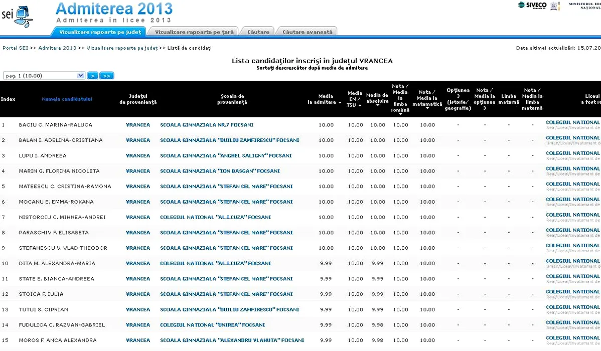 REPARTIZARE LICEE 2013 VRANCEA pe EDU.RO. Admitere la liceu 2013: rezultatele au fost afișate online. Nouă elevi cu media 10 au ales două colegii din Focșani