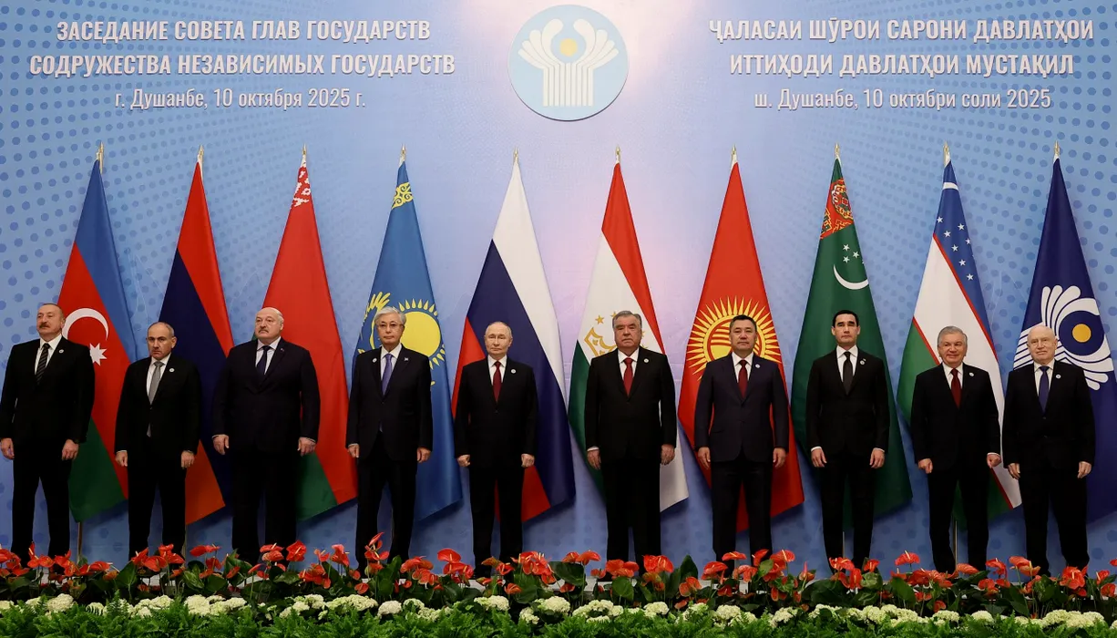 9023138 10.10.2025 Azerbaijani President Ilham Aliyev, Armenian Prime Minister Nikol Pashinyan, Belarusian President Alexander Lukashenko, Kazakh President Kassym-Jomart Tokayev, Russian President Vladimir Putin, Tajik President Emomali Rahmon, Kyrgyz President Sadyr Japarov, Turkmen President Serdar Berdimuhamedov, Uzbek President Shavkat Mirziyoyev and CIS Secretary General Sergei Lebedev pose for a family photo before a meeting of the Commonwealth of Independent States (CIS) Council of Heads of State at the Palace of the Nation in Dushanbe, Tajikistan. Vladimir Smirnov / Sputnik