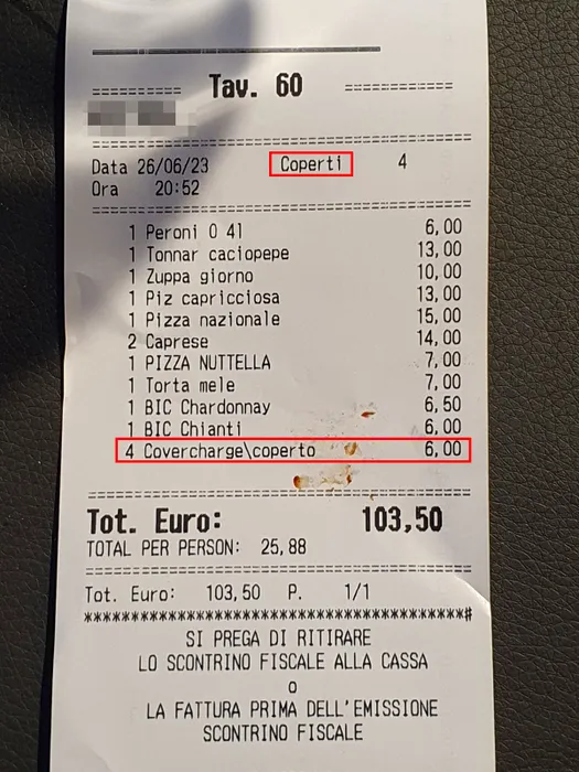Nota de plată de la un restaurant din Italia, pe care este trecută și coperto