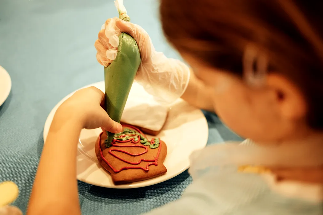 Close-up of a girl painting Christmas cookies with a pastry bag. A girl decorates a ginger yummy with green cream on a blue table. Preparation for the new year.