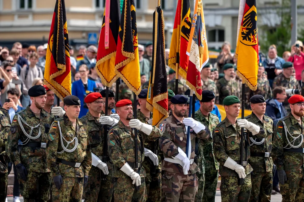 Membrii Brigăzii 45 Blindate germane participă la ceremonia de apel din Piața Catedralei din Vilnius, Lituania, pe 22 mai 2025.