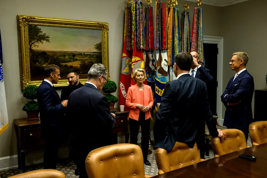 August 18, 2025, Washington, District Of Columbia, USA: President Emmanuel Macron, Ukrainian President Volodymyr Zelenskyy, European Commission President Ursula von der Leyen, German Chancellor Friedrich Merz, Finnish President Alexander Stubb, Secretary General Mark Rutte of NATO, and U.K. Prime Minister Keir Starmer wait in the Roosevelt Room as President Donald Trump makes a call with Russian President Vladimir Putin in the Oval Office, Monday, August 18, 2025. (Credit Image: � Daniel Torok/White House/ZUMA Press Wire)