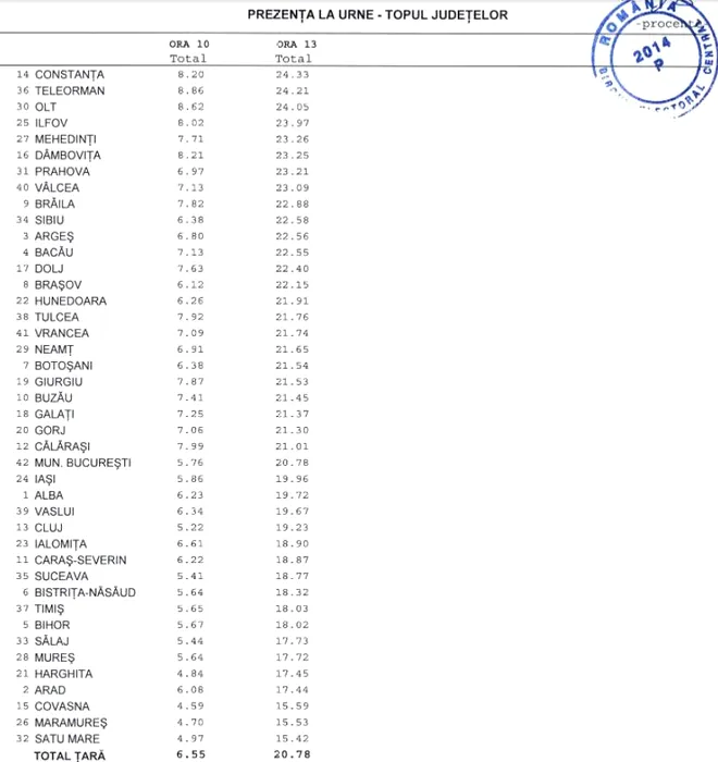 REZULTATE ALEGERI PREZIDENȚIALE 2014. Prezența la vot la ora 13:00. Topul celor mai active județe