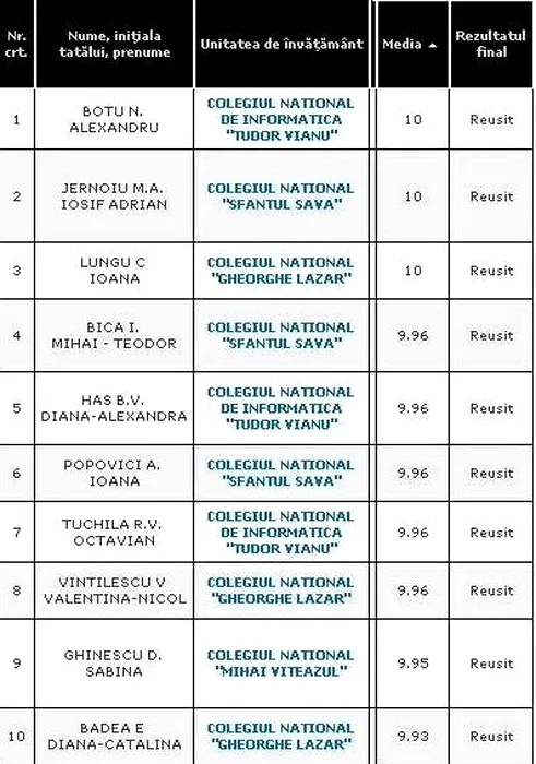 REZULTATE BACALAUREAT 2012 EDU.RO BUCUREȘTI. Top 10 note pe Capitală
