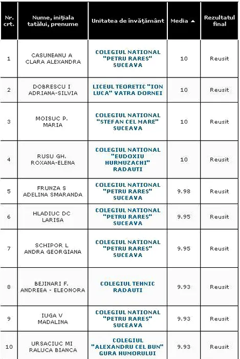 REZULTATE BACALAUREAT 2012 EDU.RO SUCEAVA. Top 10 note pe județ