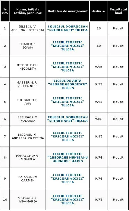 GALERIE FOTO: REZULTATE BACALAUREAT 2012 EDU.RO TULCEA. Top 10 note pe județ