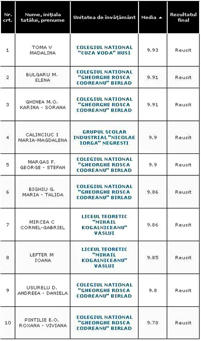 REZULTATE BACALAUREAT 2012 EDU.RO VASLUI. Top 10 note pe județ