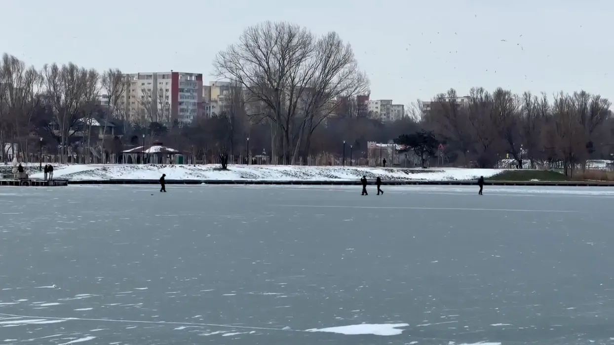 Risc major la Constanța: tineri surprinși că se plimbă periculos pe gheața lacului, în ciuda avertismentelor