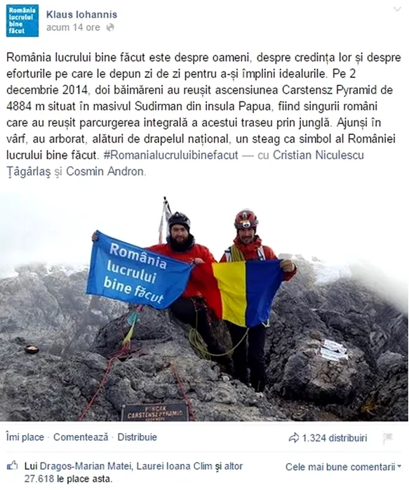 „România lucrului bine făcut” a urcat la 4.884 de metri, în Papua, Indonezia. Klaus Iohannis a publicat această fotografie pe pagina sa de Facebook