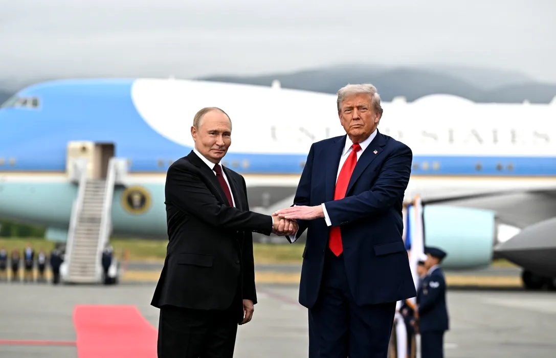 8981995 15.08.2025 U.S. President Donald Trump greets Russian President Vladimir Putin on the tarmac after they arrived to attend a meeting at Joint Base Elmendorf-Richardson in Anchorage, Alaska, the United States. Sergey Bobylev / Sputnik