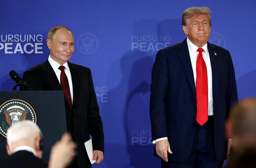 15.08.2025 Russian President Vladimir Putin and U.S. President Donald Trump stand on a podium at the end of a joint news conference following their meeting at Joint Base Elmendorf-Richardson in Anchorage, Alaska, the United States. Sergey Bulkin / Sputnik