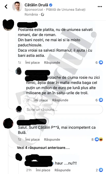 Comentarii la postarea lui Cătălin Drulă pe Facebook