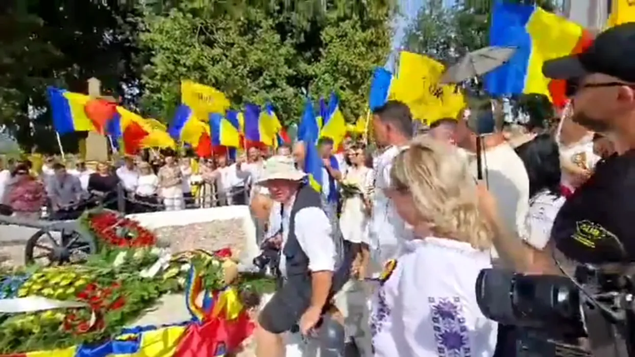 GALERIE FOTO: Scandal la Țebea. Fotograful lui George Simion s-a urcat pe mormântul lui Avram Iancu pentru a-i face poze liderului AUR. Preot: „Ieșiți afară!”
