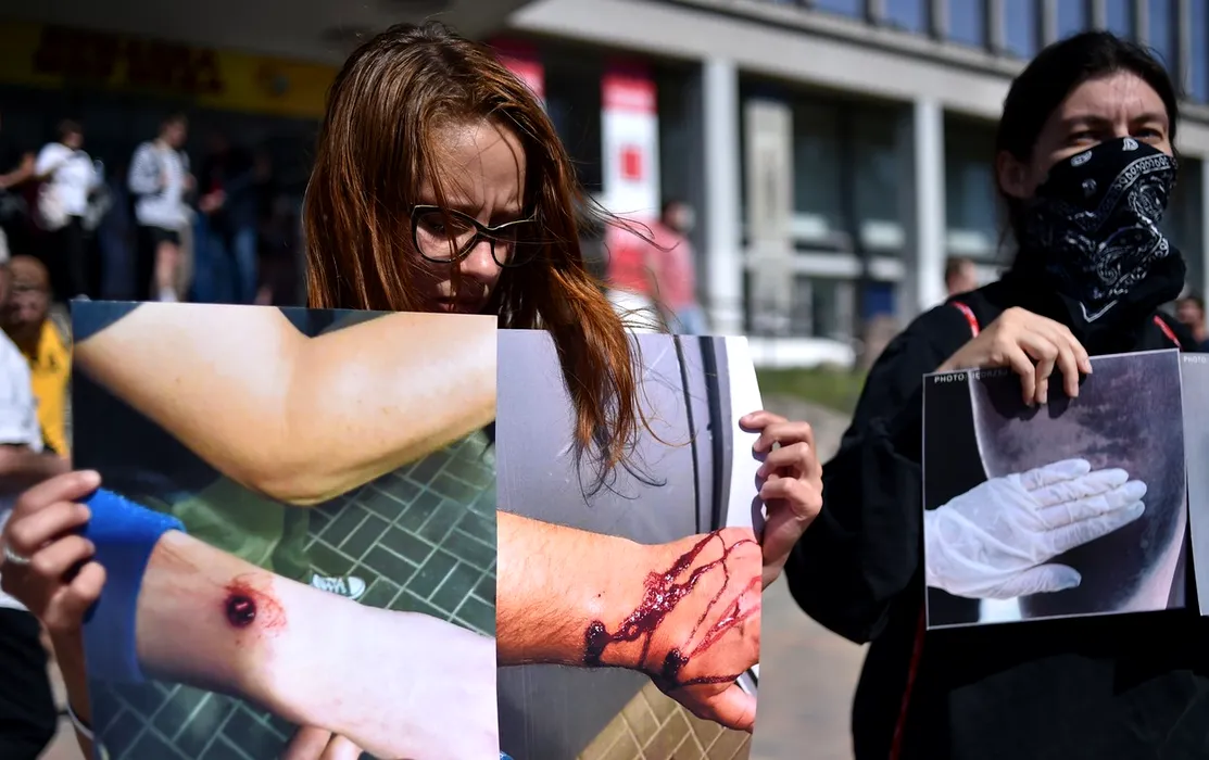 Protestele din Belarus au continuat și sâmbătă, 15 august, iar unii oameni țineau în brațe pancarde cu poze în care apar manifestanți bătuți de autorități / Sursă FOTO: Profimedia Images