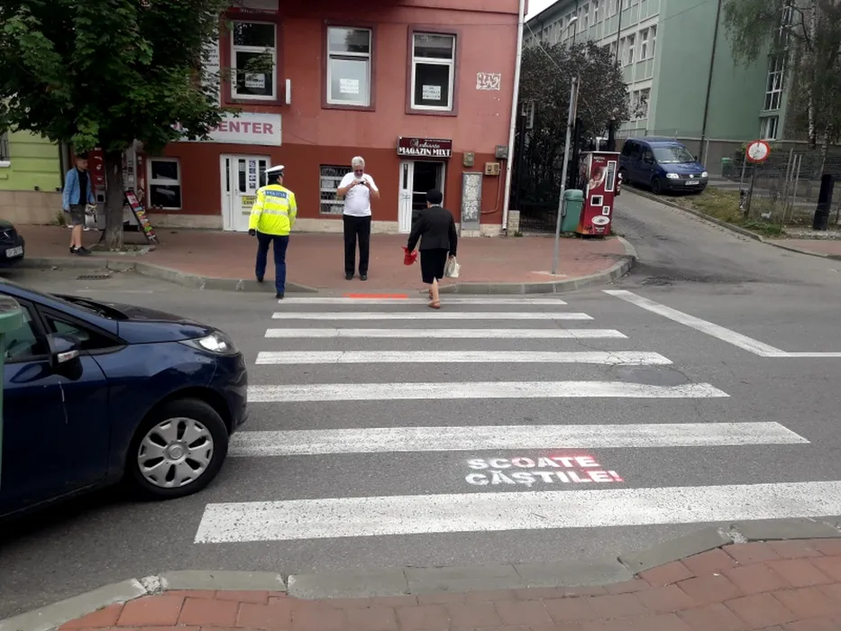 SCOATE CĂȘTILE! Nu folosi telefonul! Elevii din Suceava, întâmpinați la trecerile de pietoni cu MESAJE PE ASFALT