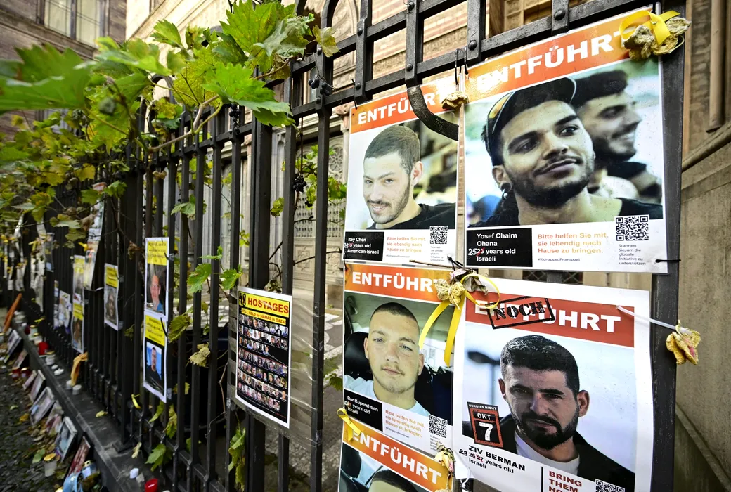 Portraits of hostages and victims of Palestinian militant group Hamas are attached to the fence of the New Synagogue in Berlin on October 6, 2025, one day before the second anniversary of Hamas's October 7, 2023 attack on Israel. Delegations from Hamas, Israel and the United States are due to convene in Egypt for talks on October 6, with US President Trump urging negotiators to "move fast" to end the nearly two-year war in Gaza. Both Hamas and Israel have responded positively to Trump's proposal for an end to the fighting and the release of captives in Gaza in exchange for Palestinians held in Israeli jails.,Image: 1043825382, License: Rights-managed, Restrictions: , Model Release: no, Credit line: John MACDOUGALL / AFP / Profimedia
