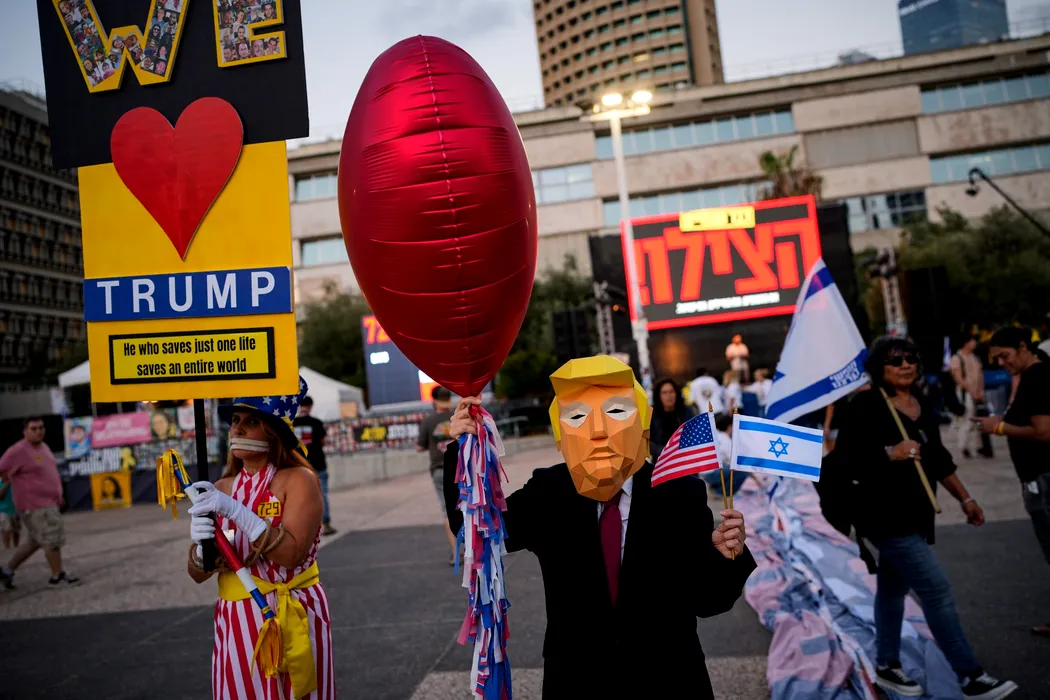 A woman wearing a mask depicting U.S. president Donald Trump attends a rally calling for the release of all hostages held in the Gaza Strip and urges a ceasefire, in Tel Aviv, Israel, Saturday, Oct. 4, 2025. ahead of the second anniversary of the Israel-Hamas war.,Image: 1043324506, License: Rights-managed, Restrictions: This content is intended for editorial use only. For other uses, additional clearances may be required., Model Release: no, Pictured: Donald Trump, Credit line: Ohad Zwigenberg / AP / Profimedia
