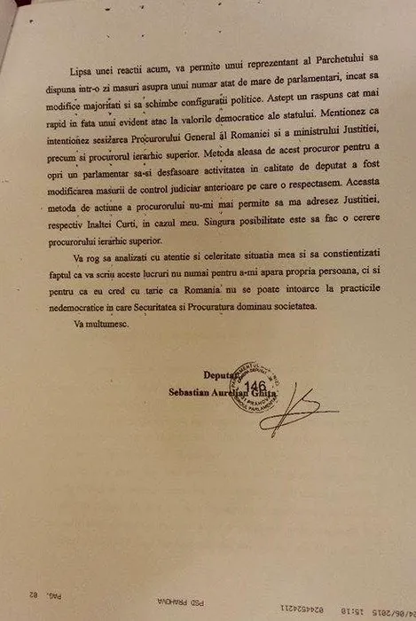 Sebastian Ghiță reclamă un abuz al DNA asupra lui. Scrisoarea trimisă Camerei Deputaților: „Este un evident atac la valorile democratice ale statului. Decizia DNA este extrem de gravă și neconstituțională”