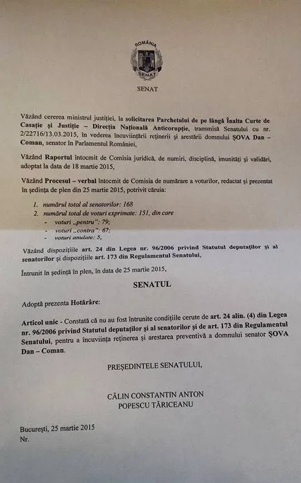 Senatul a respins proiectul de hotărâre în cazul lui Dan Șova, dar Tăriceanu este obligat să redacteze o hotărâre de respingere sub propria semnătură
