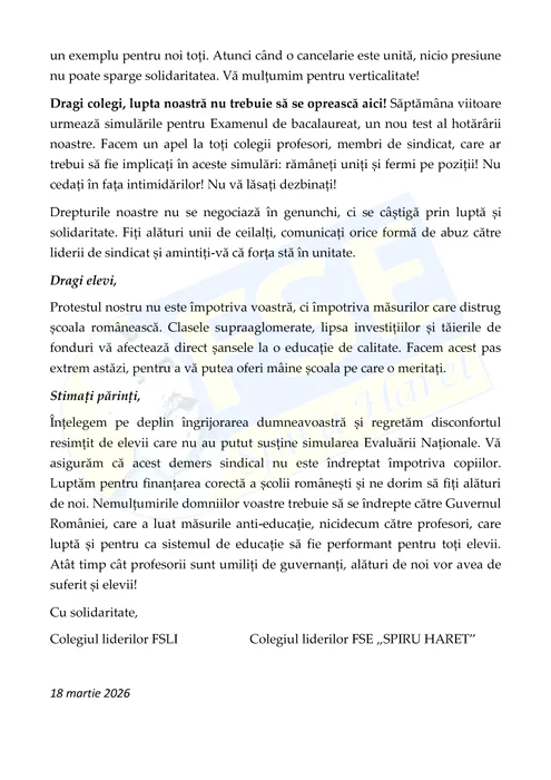 Sindicatele din Educație avertizează Guvernul Bolojan: „Nu vă îmbătați cu apă rece după simulări, greva generală rămâne o opțiune”