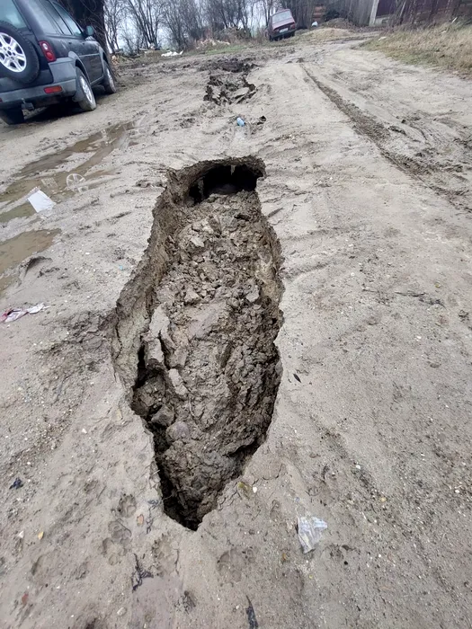 Situație disperată pentru locuitorii din satul Basarabi, județul Dolj. Trei autoturisme și mașina de gunoi au rămas blocate în gropi de un metru