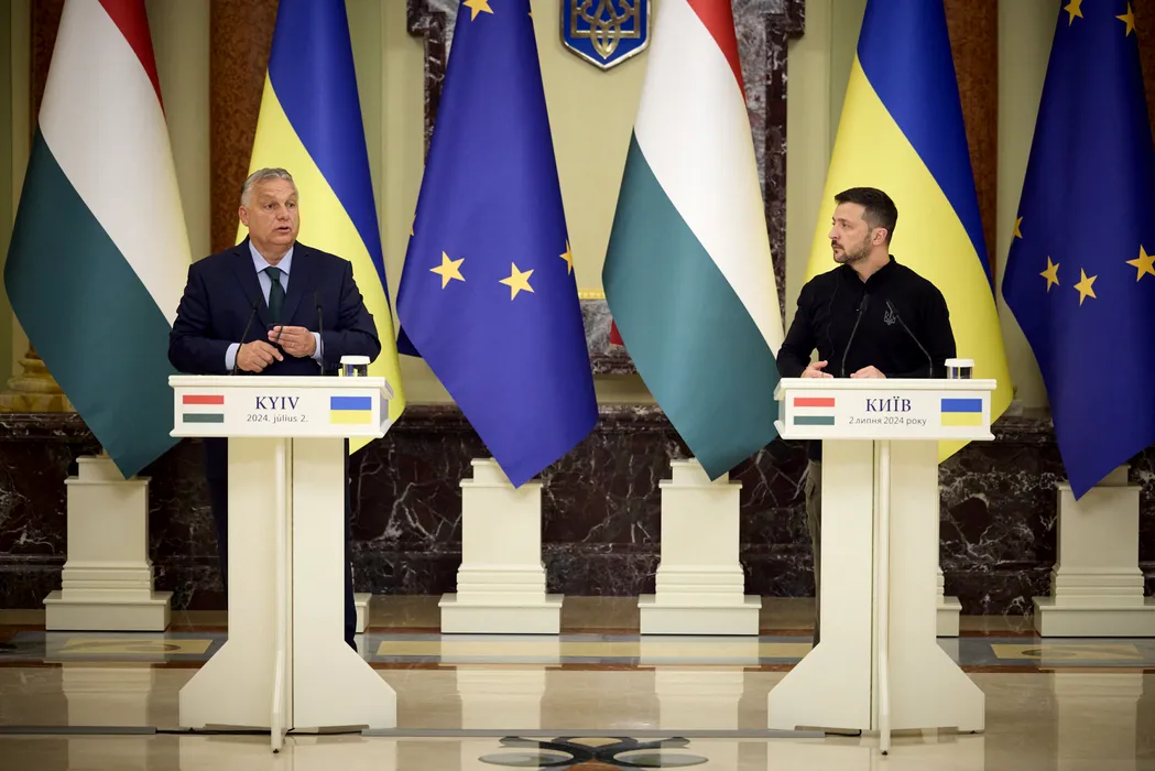 Handout - Hungary's PM Viktor Orban and Ukraine's President Volodymyr Zelensky during a press conference, after their bilateral meeting, in Kyiv, Ukraine, on July 02, 2024. Hungarian Prime Minister Viktor Orban visited Kyiv Tuesday, a day after he took over the EU's rotating presidency. Volodymyr Zelenskyy thanked Hungary for supporting Ukrainians and providing humanitarian aid to our country. He also noted the country's participation in the first Peace Summit and support for the final communique. Photo by Ukrainian Presidency via ABACAPRESS.COM