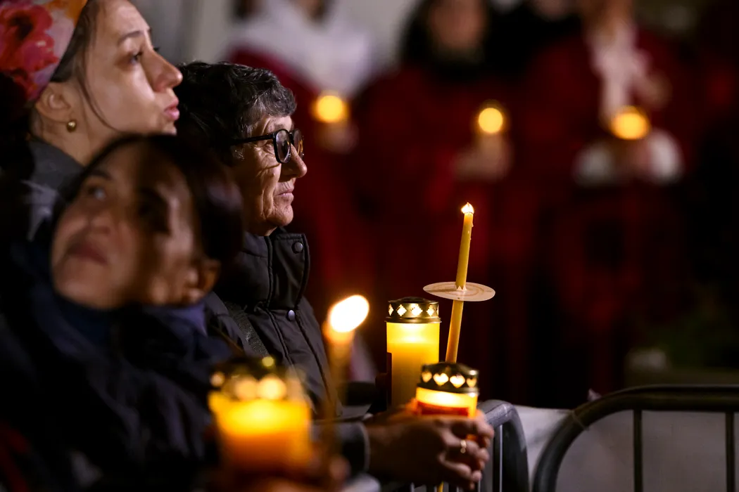 Credinciosi tin candele aprinse la finalul slujbei de Inviere, la Catedrala Patriarhala din Bucuresti, duminica, 20 aprilie 2025. ALEXANDRU DOBRE/ MEDIAFAX FOTO.