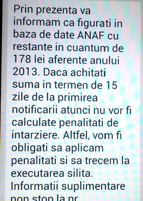 GALERIE FOTO: SMS-ul primit de mai multe persoane din București și Brașov. „Figurați în baza de date ANAF cu restanțe”. Avertismentul Fiscului