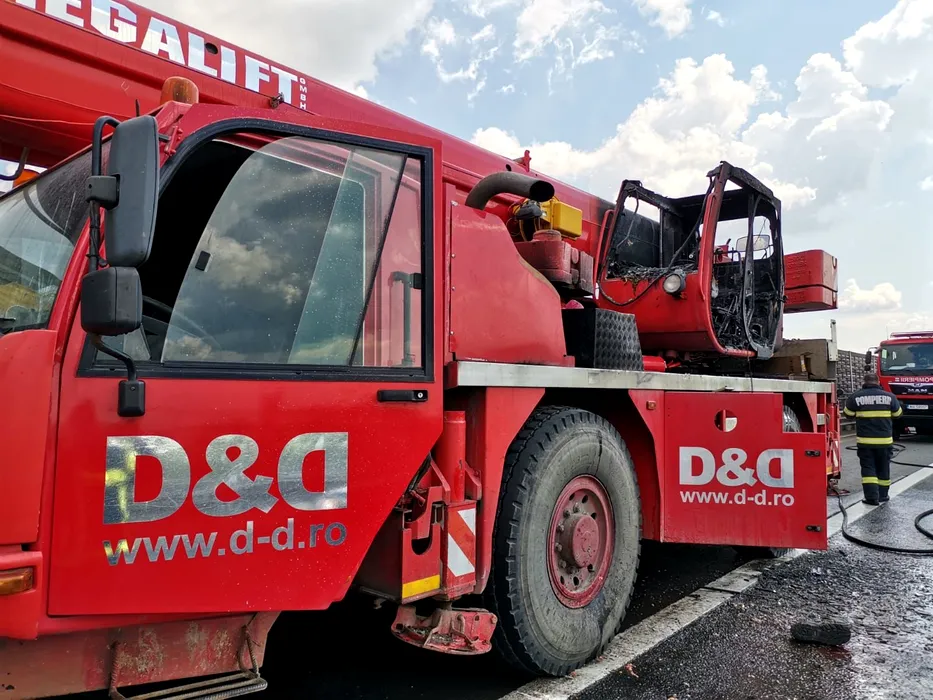 FOTO | Șoferul unei automacarale, accidentat mortal în timp ce stingea incendiul izbucnit în cabina utilajului