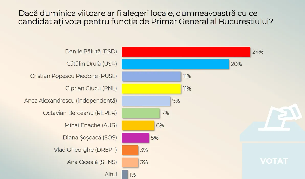 GALERIE FOTO: Sondaj. Daniel Băluță, favorit în cursa pentru Primăria Capitalei. Dacă săptămâna viitoare ar fi alegeri, acesta ar câștiga detașat