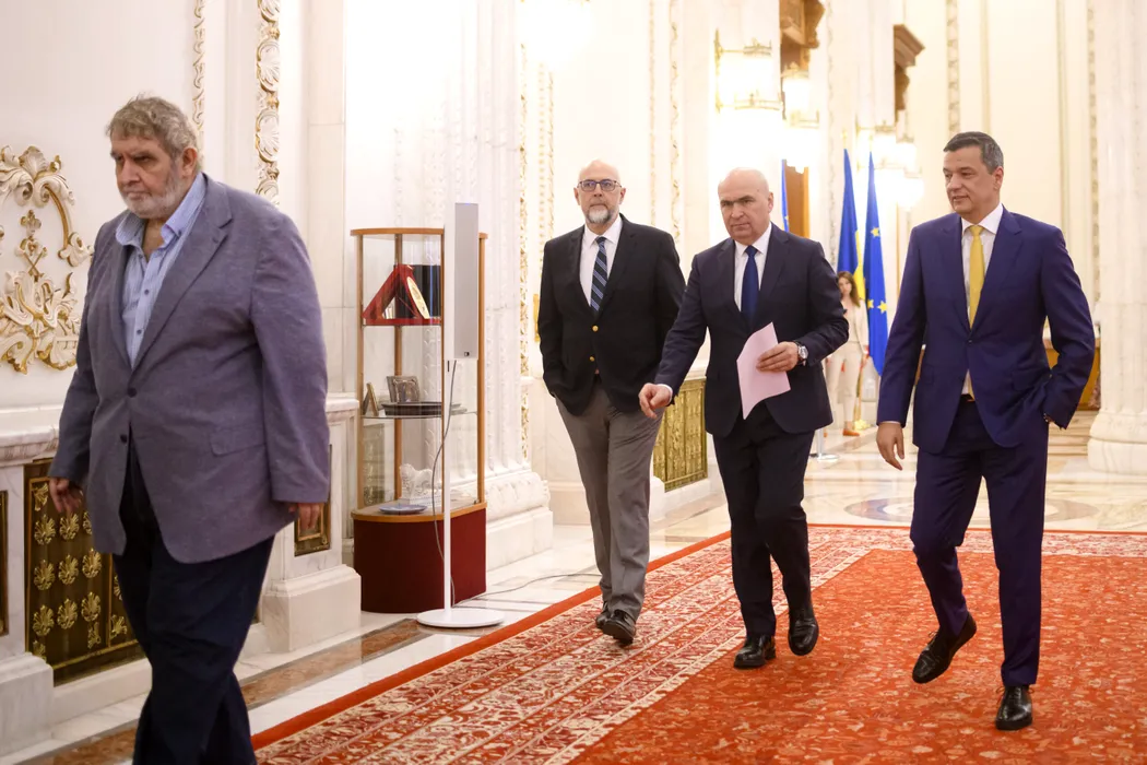 Varujan Pambuccian, Kelemen Hunor, premierul Ilie Bolojan si Sorin Grindeanu (s-d) se pregatesc sa sutina declaratii de presa la finalul semnarii acordul politic intre PSD, PNL, USR, UDMR si Grupul Minoritatilor privind un nou guvern si un nou program de guvernare, la Palatul Parlamentului, luni, 23 iunie 2025, in Bucuresti. ALEXANDRU DOBRE / MEDIAFAX FOTO