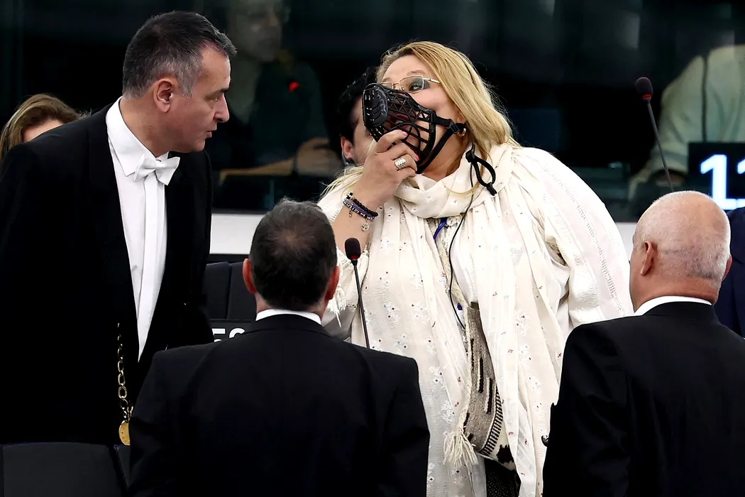 MEP Diana Iovanovici Sosoaca (C) wears a muzzle surrounded by bailiffs as EU Commission president nominee delivers a speech during her statement for her candidacy at the European Parliament in Strasbourg, eastern France, on July 18, 2024.,Image: 890556306, License: Rights-managed, Restrictions: , Model Release: no