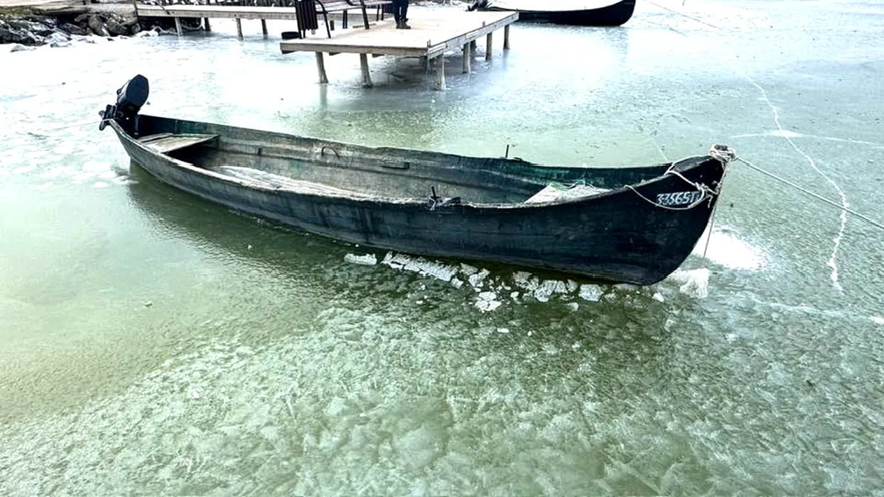 Spectacolul iernii în Dobrogea. Bărci prinse în gheață pe lacul Razelm