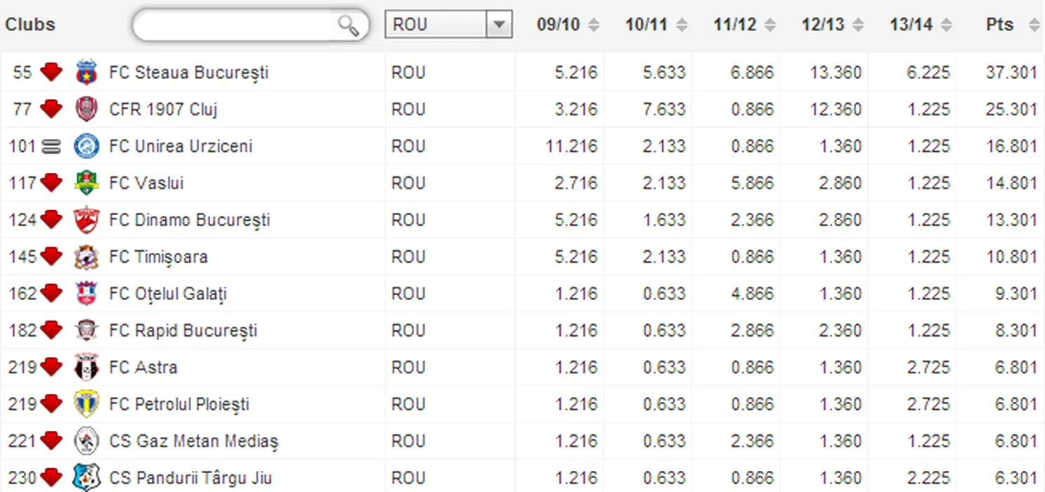Steaua a devansat două echipe din top 10 în clasamentul UEFA al celor mai bune cluburi de fotbal