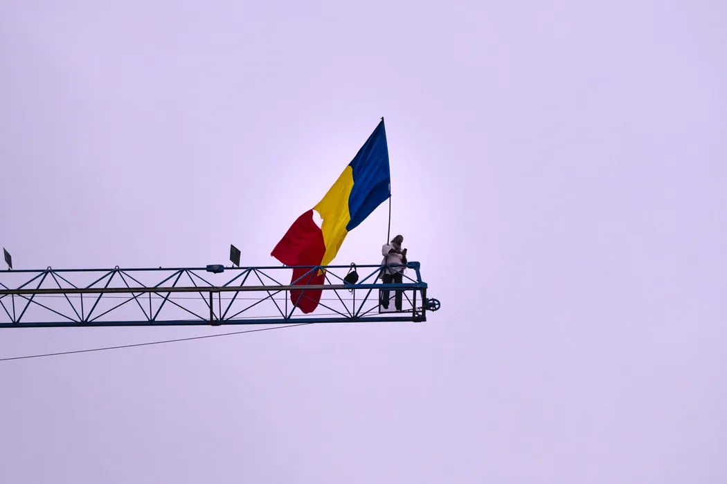 Protestatarul Cezar Avramuta flutura un steag al Romaniei in timp ce sta pe o macara deasupra bulevardului Iuliu Maniu, in Bucuresti, duminica, 8 decembrie 2024. ALEXANDRU DOBRE/ MEDIAFAX FOTO.