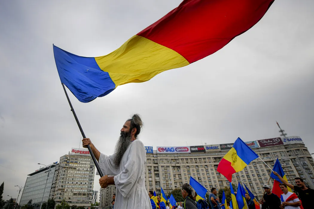 Cezar Avramuta participa la un protest impotriva obligativitatii certificatului "Verde" COVID-19, in piata Victoriei din Bucuresti, vineri, 17 septembrie 2021. Guvernul a aprobat vineri, prin hotarare de guvern, introducerea obligativitatii prezentarii certificatului digital COVID acolo unde incidenta trece de 3 la mie. ANDREEA ALEXANDRU / MEDIAFAX FOTO