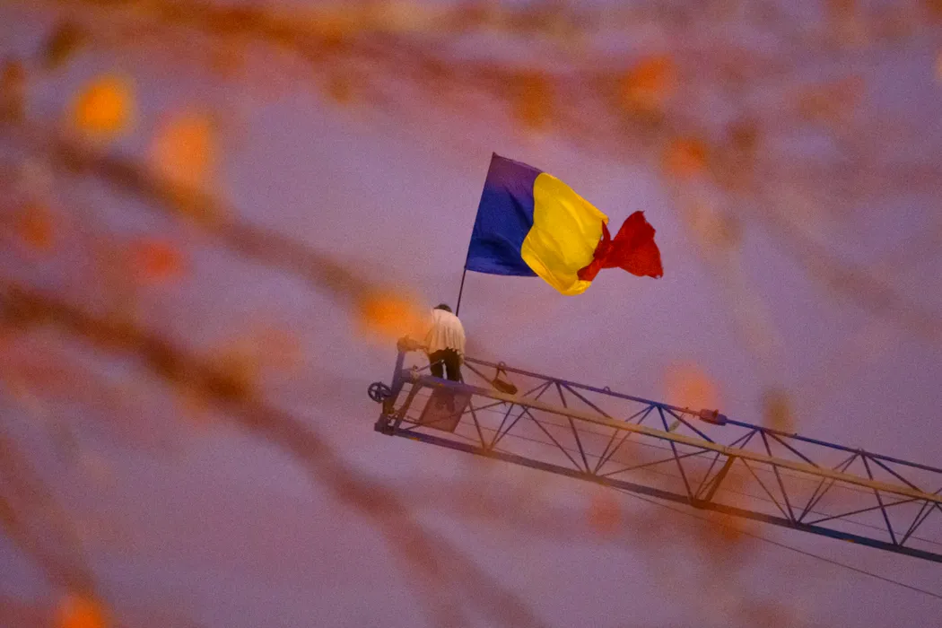 Protestatarul Cezar Avramuta flutura un steag al Romaniei in timp ce sta pe o macara deasupra bulevardului Iuliu Maniu, in Bucuresti, duminica, 8 decembrie 2024. ALEXANDRU DOBRE/ MEDIAFAX FOTO.